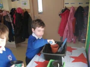 We planted some mange tout in pots. We put them on the windowsill. We will check them every day to make sure they have enough water, light and heat.