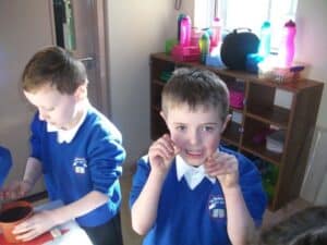 After the class visits the Sixth class pupils served tea and refreshments in the hall and the grandparents all had a little chat. Sixth class pupils made buns, cakes and apple tarts with some of the parents and grandparents yesterday! We would especially like to thank Ann Dunne for organising the ICA ladies to come in and work with the children. Our thanks also to Lorraine Boyle and Roisin Holmes for helping the children with the baking. Finally we would like to thank Barbara Keane and Catherine Woods for their help in serving the refreshments.