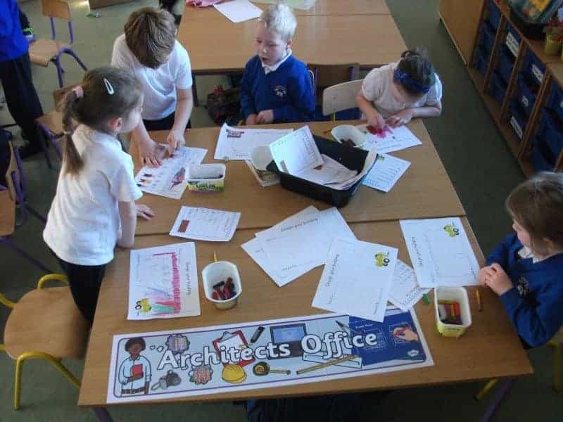 We designed buildings in the architect’s office and made lists of the materials we would need. We built buildings out of boxes on the construction site. We played with the pig and wolf puppets in the small world area. We made pig masks and acted out the story in the drama corner. And we made ‘Wanted’ posters for the big bad wolf in the Garda Station. Check out our photos!
