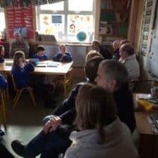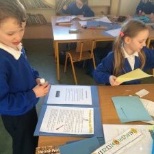 Ms Cawley teaches First and Second Classes. There are 21 children in her classroom, 10 in First Class and 11 in Second Class. Ms. Lambe and Suzanne come in to help us during the day.